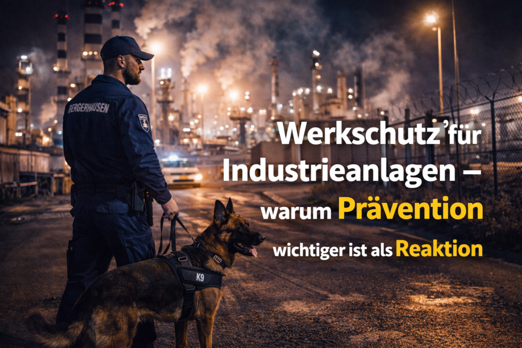 Der Sicherheitsdienst BERGERHAUSEN – Sicherheit mit Hund bietet individuelle Sicherheitslösungen für Industrieanlagen, Produktionsstätten und Gewerbeobjekte.